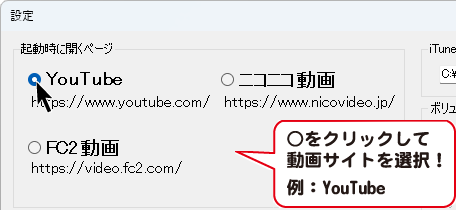 最初に表示したい動画サイトを選択します。