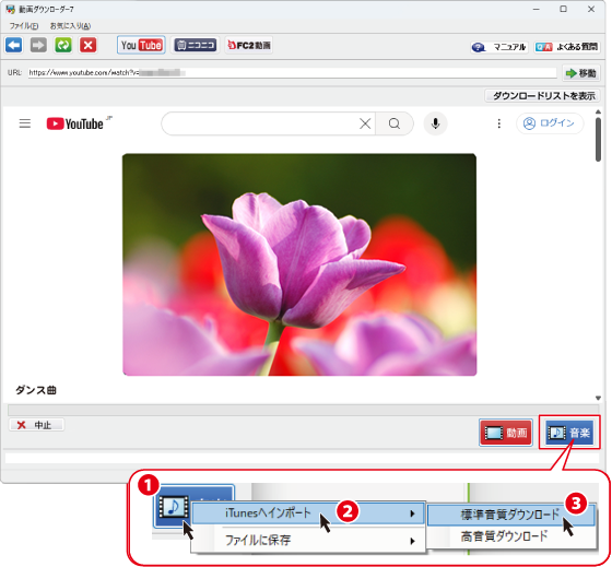 (下図例:「iTunesへインポート」→「標準音質ダウンロード」を選択)