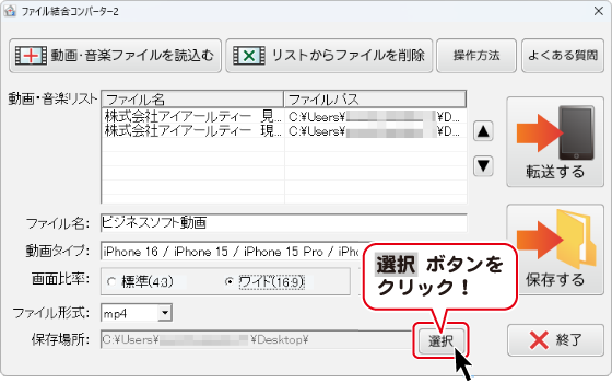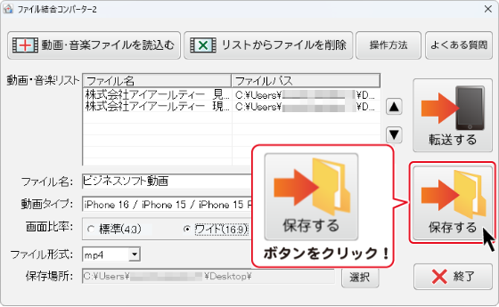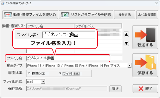 [ファイル名]に結合後の動画のファイル名を入力します。