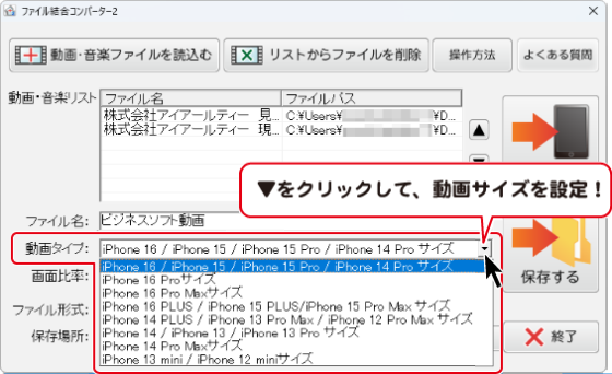 ▼をクリックして、[動画タイプ]から結合する動画のサイズを選択します。