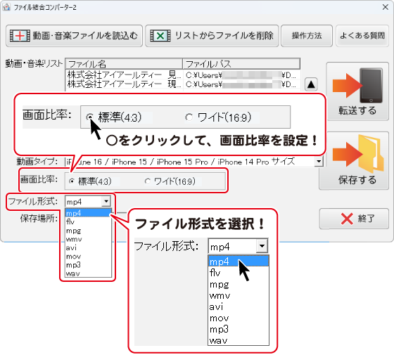 ※結合する中にMP3 / WAV形式のファイルがある場合は、