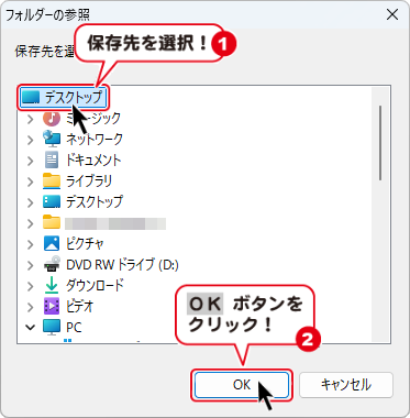 [保存場所]の 選択ボタンをクリックして、フォルダーの参照画面を表示します。