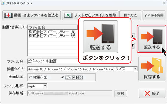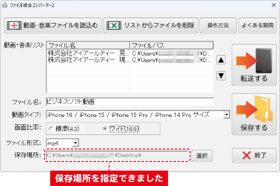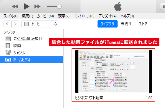 結合した動画がiTunesに転送され、「手順7」で設定した場所にファイルが保存されています。