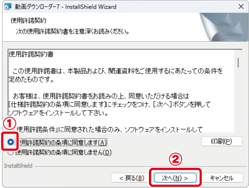 ①使用許諾契約書の内容を確認し、「使用許諾契約の条項に同意します」を