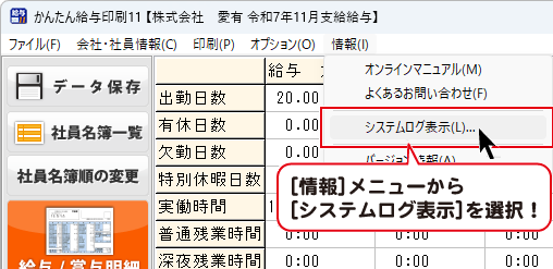 勤怠入力画面の [ 情報] メニューから[ システムログ表示] を選択すると、