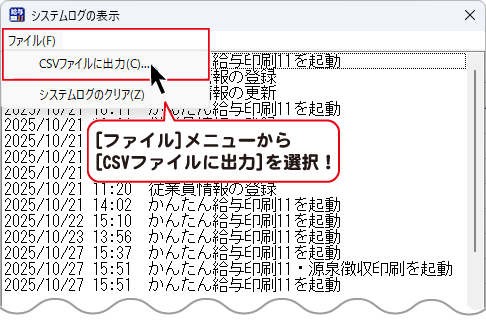 システムログの表示画面の[ファイル]メニューから[CSV ファイルに出力]を選択します。