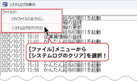 システムログの表示画面の[ファイル]メニューから[システムログのクリア]を選択します。
