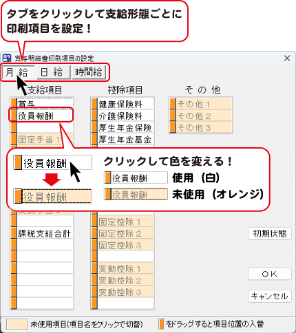 賞与項目を入力・計算、明細書を印刷する際に使用する項目を、「月給」「日給」「時間給」の支給形態ごとに設定できます。使用(印刷)する項目は白、未使用(印刷しない)の項目は薄いオレンジ色で表示されます。