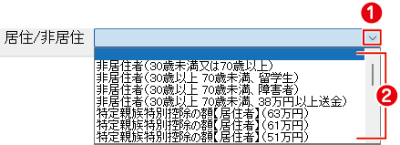 | 控除対象配偶者 | 控除対象配偶者の氏名・フリガナ・個人番号 居住/非居住 プルダウンメニューをクリックします。 一覧から、適宜区分を選択します。 ※一覧リストの詳細は、国税庁のページでご確認ください。 ![]() |