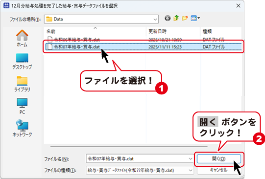 「12月分給与処理を完了した給与・賞与データファイルを選択」画面が表示されます。