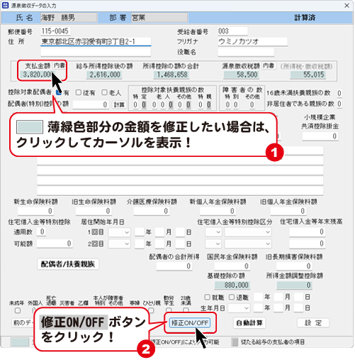 支払金額欄や、自動計算により値がセットされている欄は薄緑色になっています。