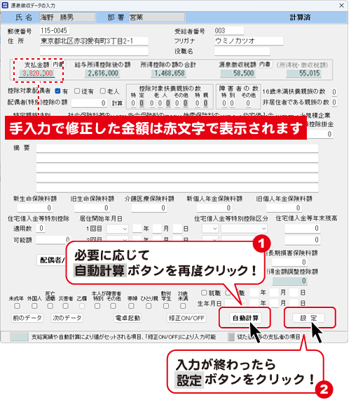 修正した金額で自動計算を行う場合は、再度自動計算ボタンをクリックします。