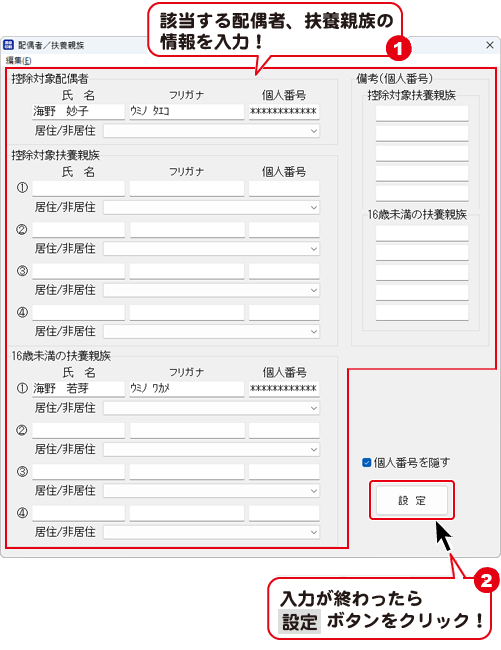 控除対象配偶者、控除対象扶養親族、16歳未満の扶養親族に該当する氏名/フリガナ/ 個人番号を入力します。