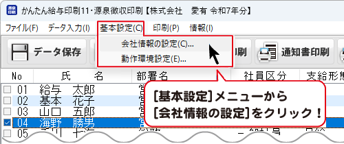 メニューバーの[基本設定]から、[会社情報の設定]を選択します。