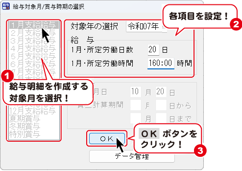 給与対象月/賞与時期の選択画面が表示されます。