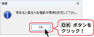 「項目名と属性や各動作環境を設定して下さい。」と表示されます。
