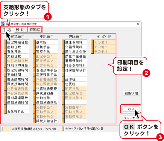 月給・日給・時間給ごとに印刷項目が設定できるようになっていますので、