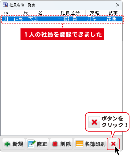 社員情報の編集画面を閉じると、社員名簿一覧表が表示され、