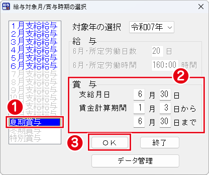 賞与の支給月日、賃金計算期間を適宜入力します。