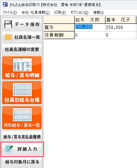賞与データを編集する際は、「詳細入力」ボタンをクリックし、