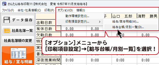 勤怠入力画面の[オプション]メニューから[印刷項目設定]→[給与台帳/ 月別一覧]を選択します。