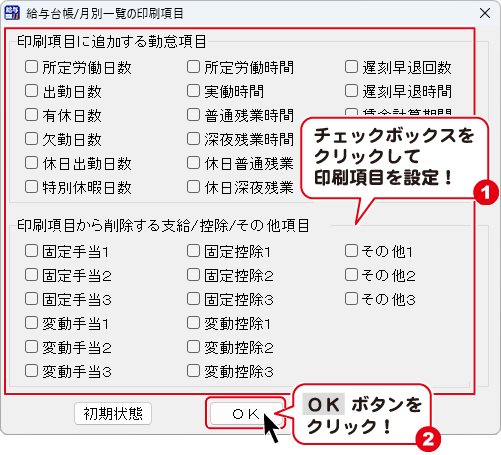 給与台帳/ 月別一覧の印刷項目画面が表示されます。