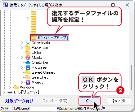 復元するデータファイルの場所を選択し、