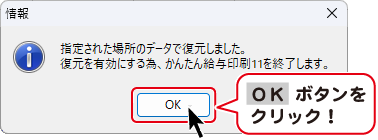 「指定された場所のデータで復元しました」というメッセージが表示されましたら、