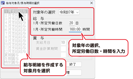 12月末締め給与が1月支払いの場合は、1月支給給与を選択します。