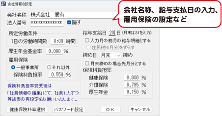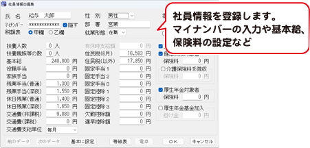 はじめて「かんたん給与印刷11」をお使いになる場合は、まずはじめに会社情報の登録、動作環境を設定、社員情報を登録などの初期設定をしてから、勤怠入力を行っていきます。