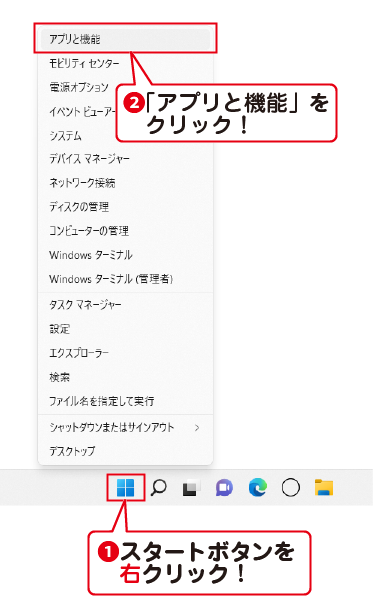 スタートボタンを右クリックして、「アプリと機能」を選択します。