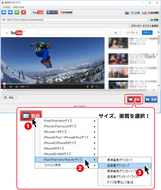 例:動画を「iPad/iPad mini/iPad Airサイズ」→「高画質ダウンロード」する