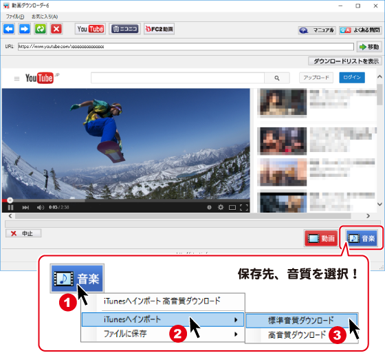 (下図例:「iTunesへインポート」→「標準音質ダウンロード」を選択)