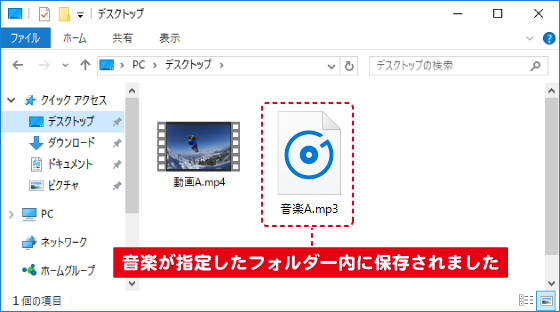 名前を付けて保存画面で指定した保存場所に動画が保存されています。