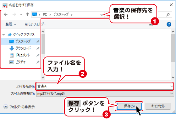 (下図例:「ファイルに保存」→「高音質ダウンロード」を選択)
