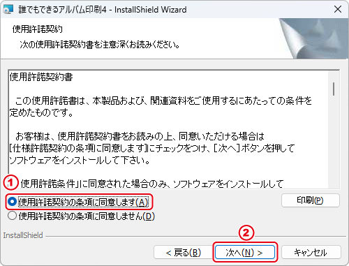 ①使用許諾契約書の内容を確認し、「使用許諾契約の条項に同意します」をクリックして