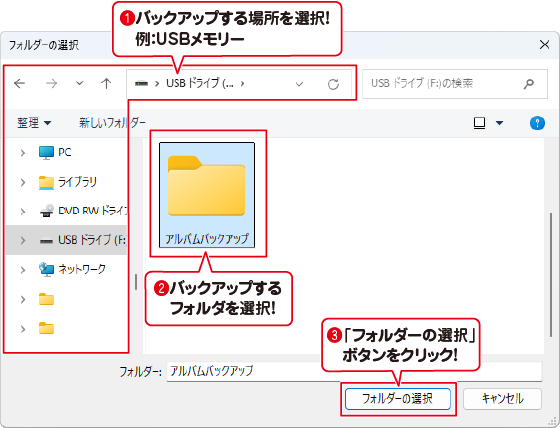 バックアップするフォルダを選択します。
