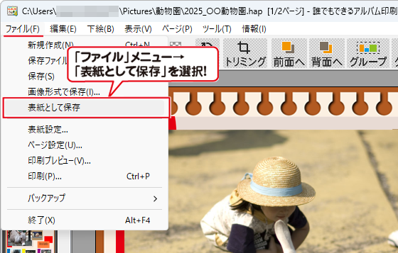 作成したアルバムページを表紙画像として保存して、アルバムの表紙に設定する手順です。