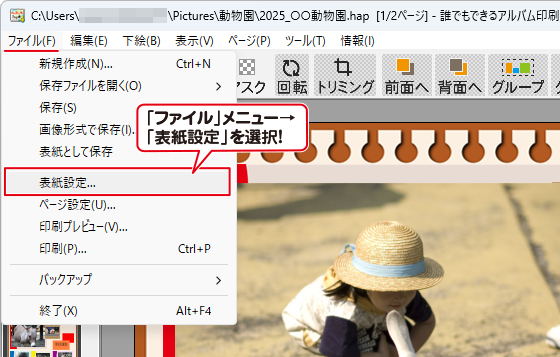 [ファイル]メニューから[表紙設定]を選択します。