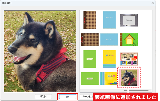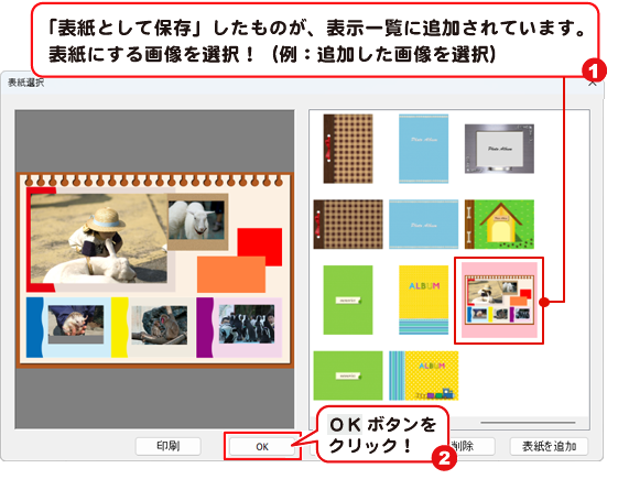 「表紙選択」画面が表示されます。表紙として保存したアルバムページが