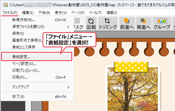表紙にしたいアルバムページを開いて表示します。