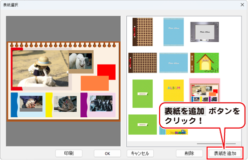 「表紙選択」画面が表示されましたら、表紙を追加ボタンをクリックします。