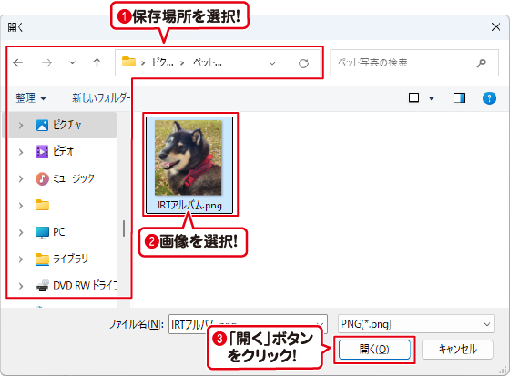 「開く」画面が表示されましたら、