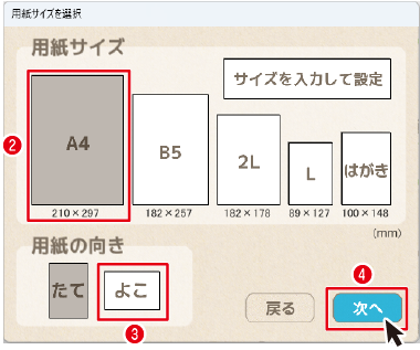 2. 用紙サイズと用紙の向きを設定します