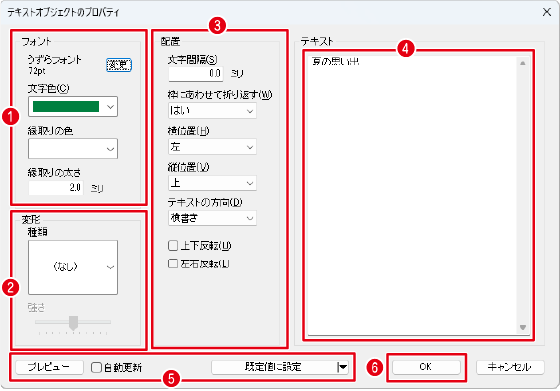 「テキストオブジェクトのプロパティ」画面