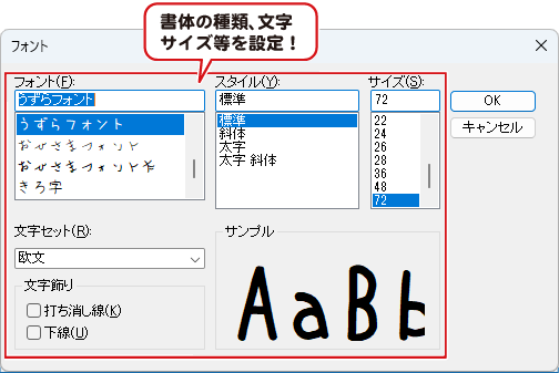 書体の種類、文字スタイル、文字サイズを設定します。