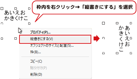 右クリックメニューから、「縦書きにする」を選択すると、縦書きになります。