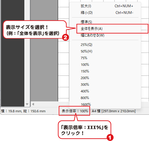 表示したい倍率などを選択します。(下図例:「全体を表示」を選択)