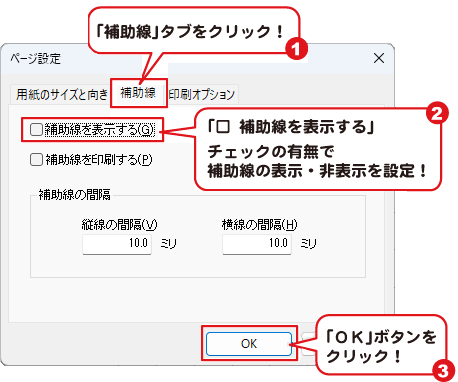 補助線を表示する」のチェック有無で、補助線表示を設定します。
