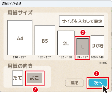 「A4」「B5」「2L判」「L判」「はがき」以外の用紙サイズで作成する場合は、